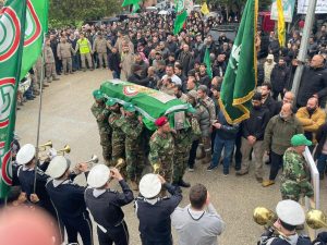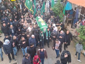 موكب التشييع انطلق من ساحة البلدة وحمله سلة من رفاقه في افواج المقاومة اللبنانية امل وتقدم الموكب حملة الرايات وفرق كشفية وسار الموكب على عزف فرقة ميثم التمار الموسيقية واناشيد حسينية للرادود محمد الجباوي